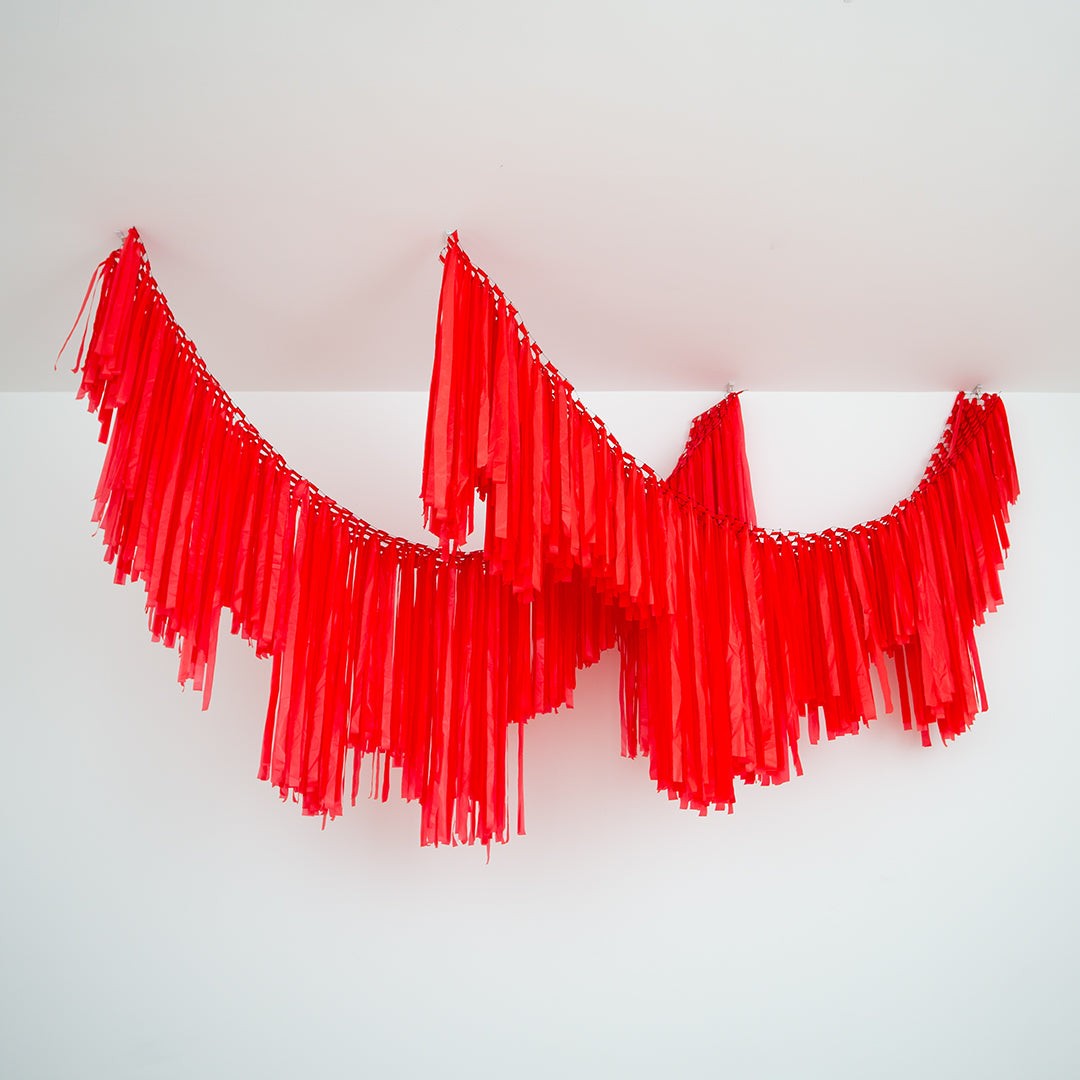 This vibrant red fringe garland works beautifully as a standalone decoration or paired with balloons and other backdrop elements for a premium, layered event look.